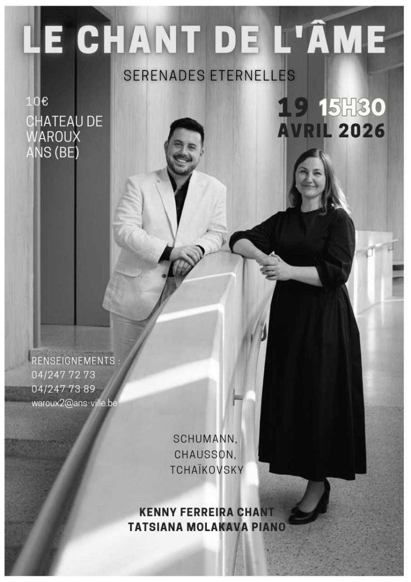 Le Château de Waroux accueillera, le 19 avril prochain, le récital « Chant de l’âme » porté par le ténor Kenny Ferreira et la pianiste Tatsiana Molakava. Un programme intimiste consacré à la mélodie romantique, dans un cadre patrimonial propice à l’émotion et à la proximité avec le public.